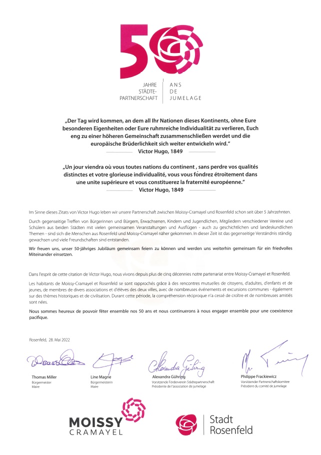 Die deutsch-französische Partnerschaft zwischen Rosenfeld und Moissy-Cramayel besteht seit dem Jahre 1970.