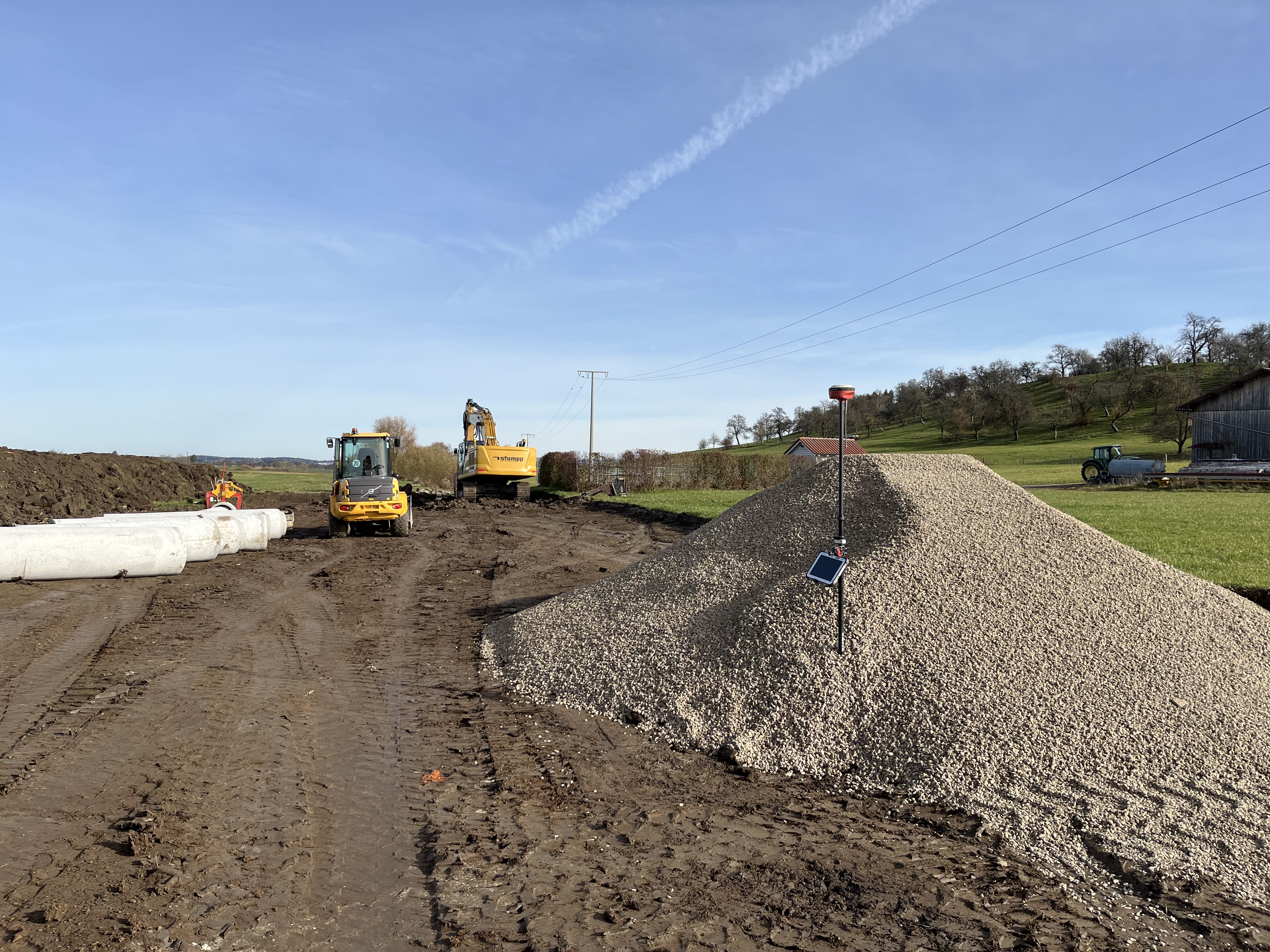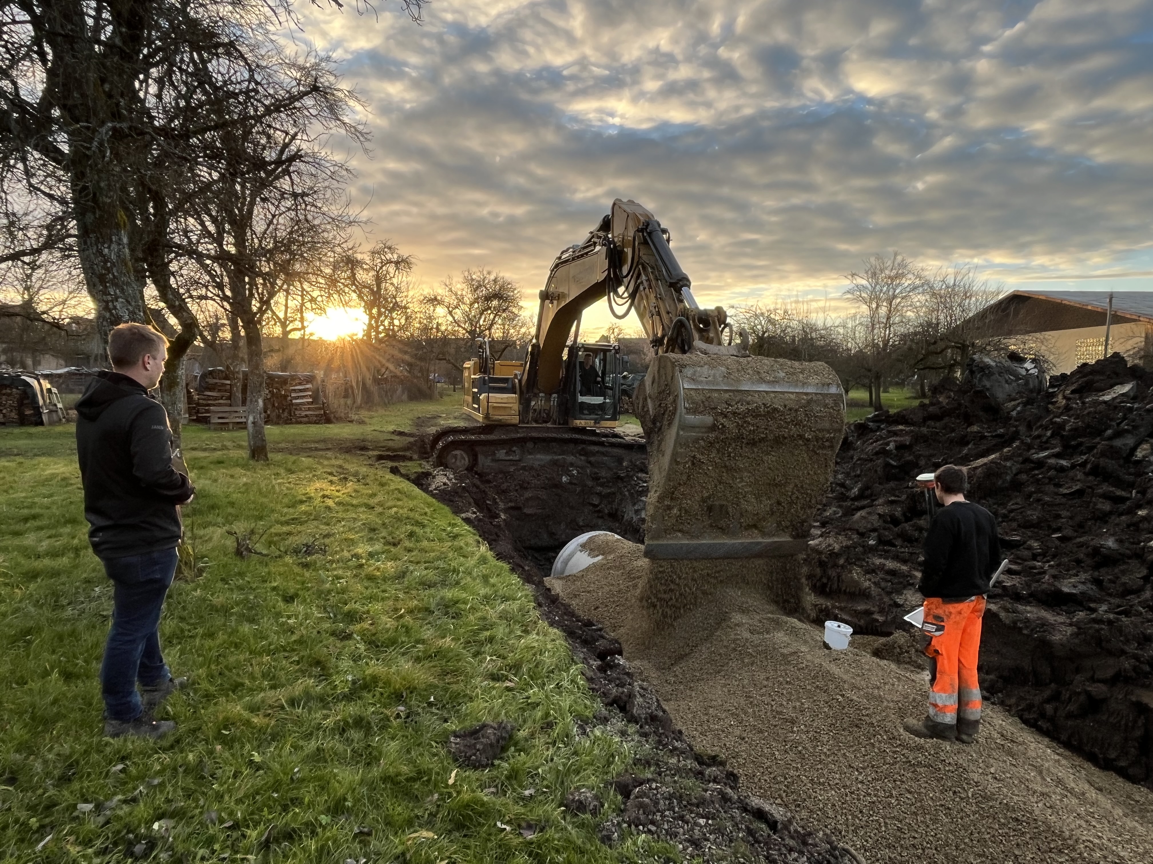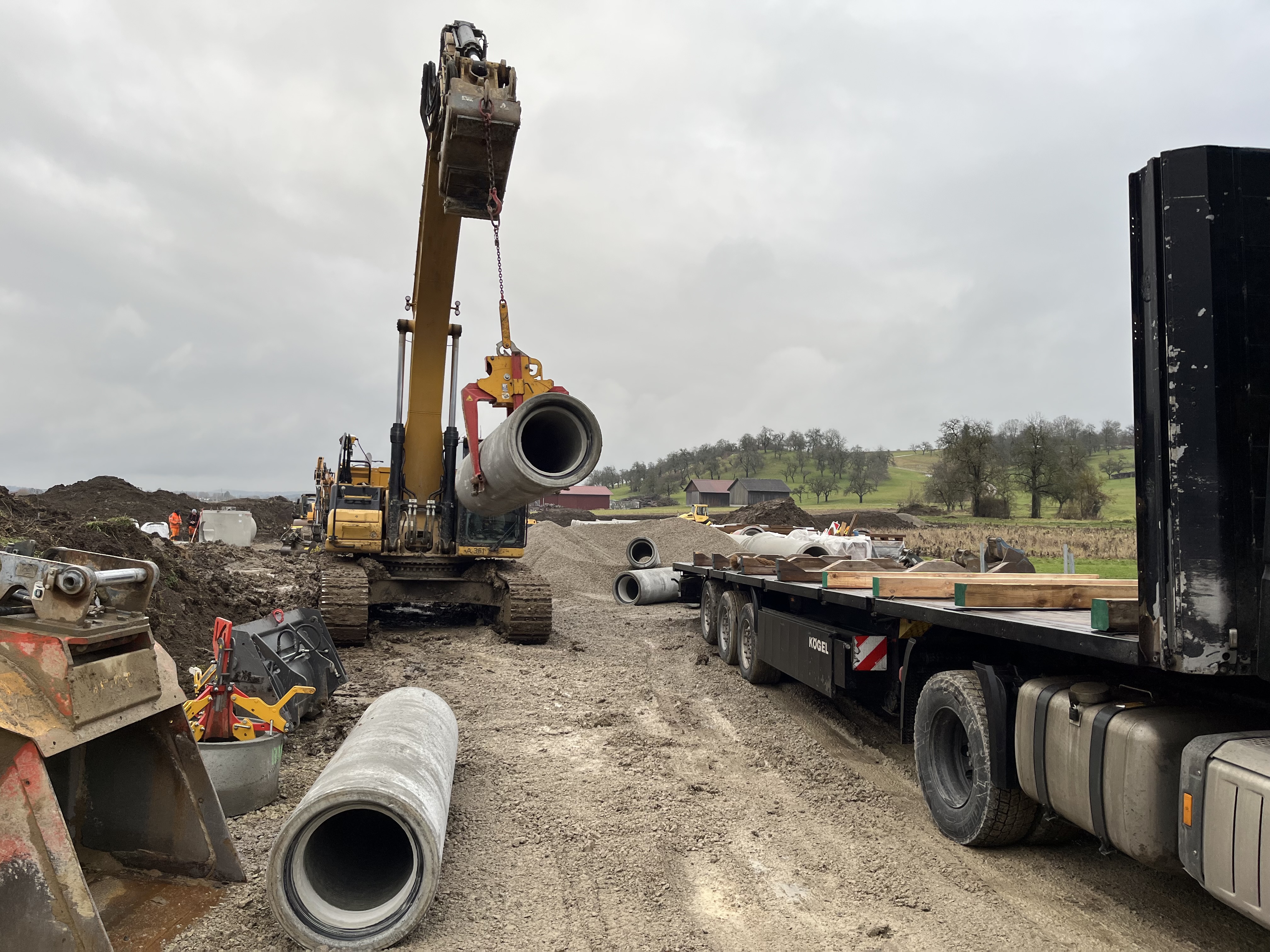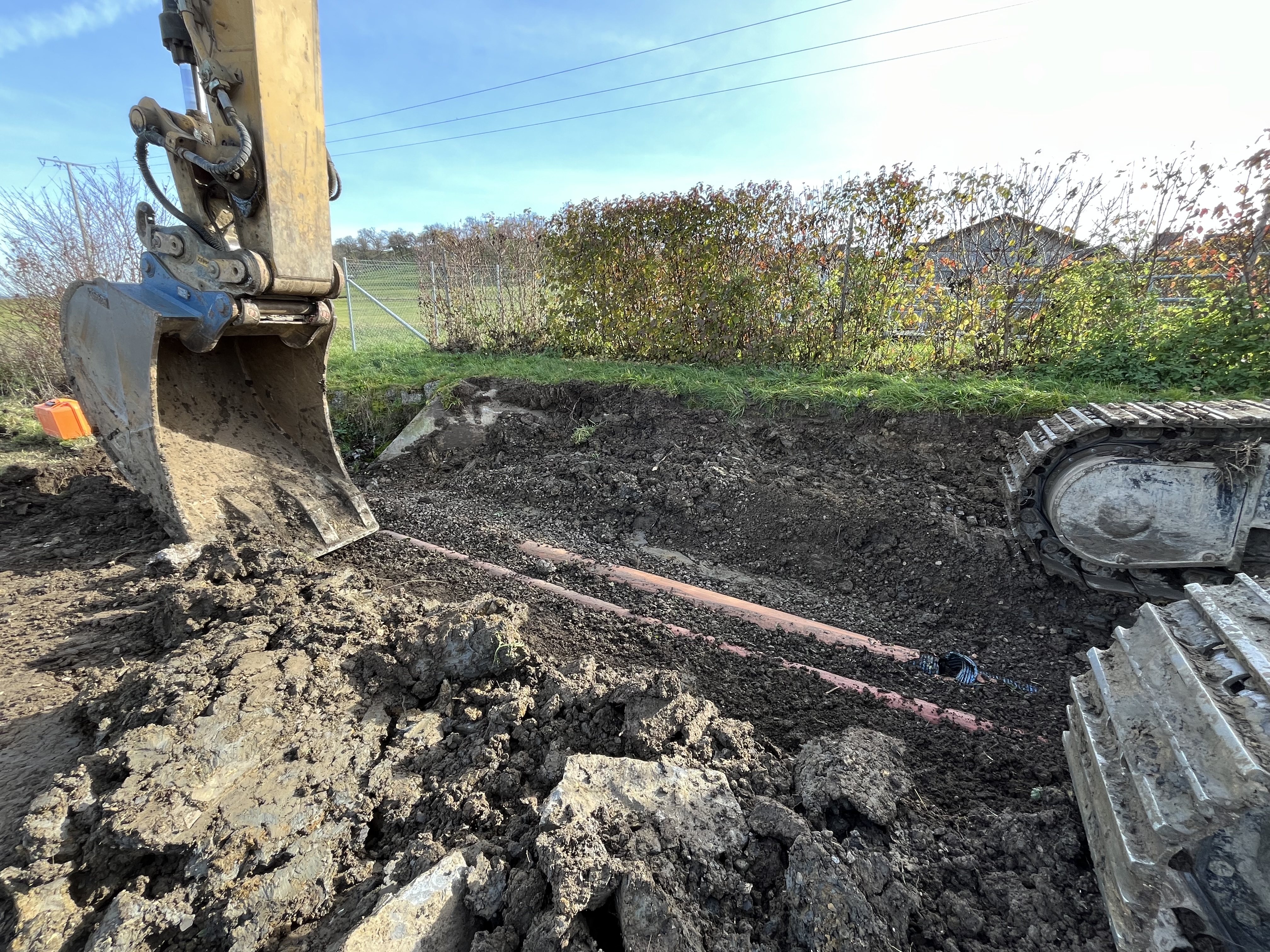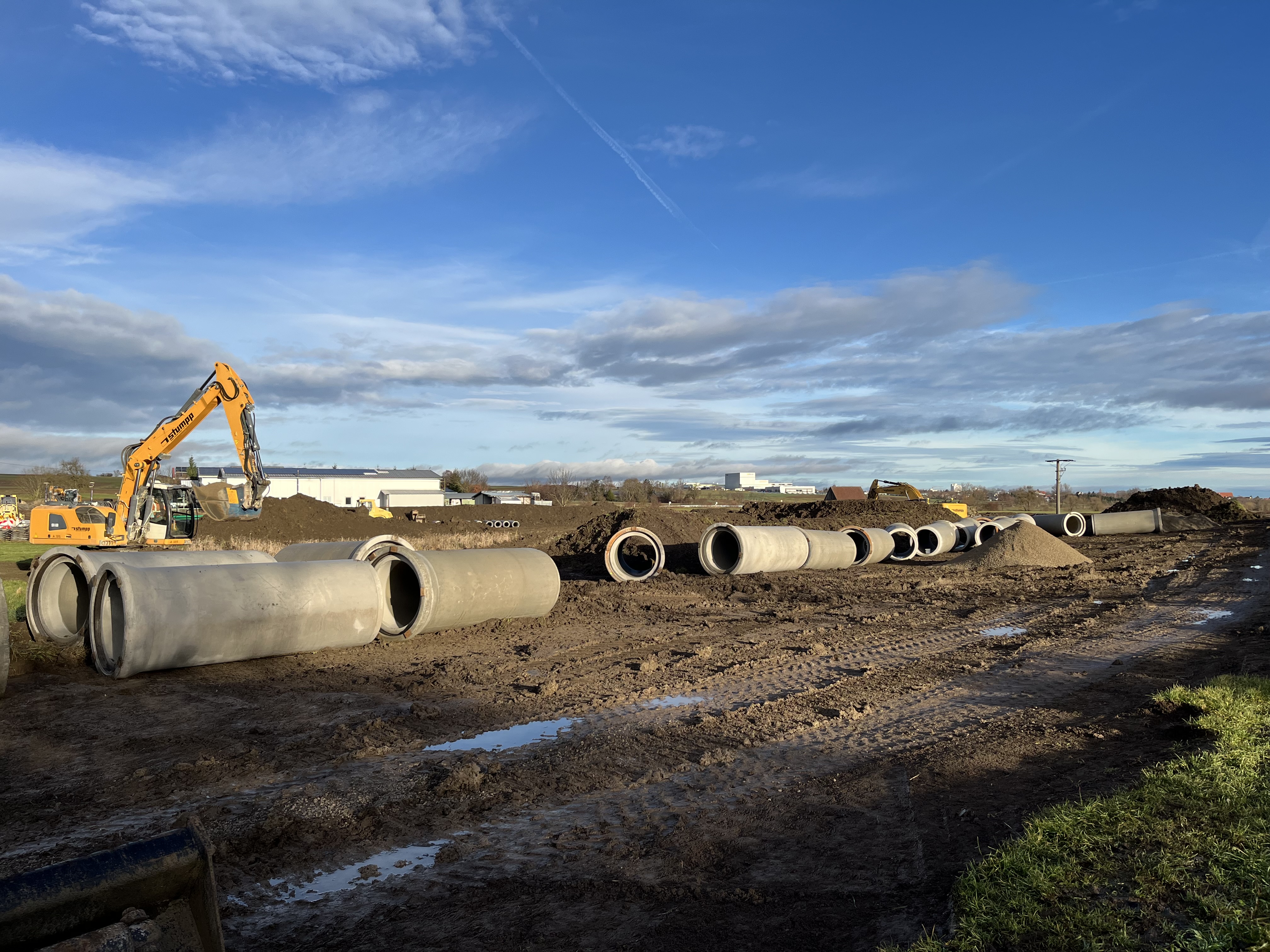 Die Kanalarbeiten im unbebauten Bereich beim Misch- und Gewerbegebiet Brühl in Leidringen laufen. Mit dieser Maßnahme wird der Abwasserkanal aufdimensioniert und an die Grundstücksgrenzen verlegt.