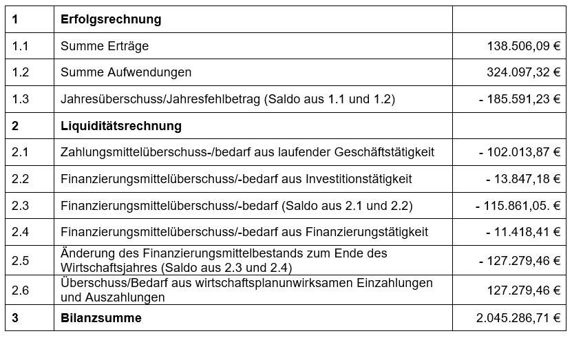 Der Eigenbetrieb Sofienbad verzeichnet im Erfolgsplan einen Jahresverlust von -184.250,- €. Die veranschlagte Änderung des Finanzierungsmittelbestands zum Ende des Wirtschaftsjahres im Liquiditätsplan beträgt -153.350,- €.